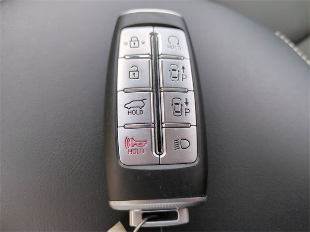 This vehicle comes equipped with Option Group 01, Genesis Certified, 10.65 Axle Ratio, 4-Wheel Disc Brakes, 8 Speakers, ABS brakes, Adaptive suspension, Air Conditioning, Alloy wheels, AM/FM radio: SiriusXM, Android Auto & Apple CarPlay, Anti-whiplash front head restraints, Auto High-beam Headlights, Auto-dimming door mirrors, Auto-dimming Rear-View mirror, Automatic temperature control, Brake assist, Bumpers: body-color, Delay-off headlights, Driver door bin, Driver vanity mirror, Dual front impact airbags, Dual front side impact airbags, Electronic Stability Control, Emergency communication system: Genesis Connected Services, Exterior Parking Camera Rear, First Aid Kit, Four wheel independent suspension, Front anti-roll bar, Front Bucket Seats, Front Center Armrest, Front dual zone A/C, Front reading lights, Fully automatic headlights, Garage door transmitter: HomeLink, Heated & Ventilated Front Bucket Seats, Heated door mirrors, Heated front seats, Illuminated entry, Knee airbag, Leather Seating Surfaces, Low tire pressure warning, Memory seat, Navigation System, Occupant sensing airbag, Outside temperature display, Overhead airbag, Overhead console, Panic alarm, Passenger door bin, Passenger vanity mirror, Power door mirrors, Power driver seat, Power Liftgate, Power moonroof, Power passenger seat, Power steering, Power windows, Radio: 14.5" Navigation System w/AM/FM/HD Radio, Rain sensing wipers, Rear air conditioning, Rear anti-roll bar, Rear reading lights, Rear seat center armrest, Rear window defroster, Rear window wiper, Remote keyless entry, Roof Rack Cross Bars, Security system, Speed control, Speed-sensing steering, Speed-Sensitive Wipers, Split folding rear seat, Spoiler, Steering wheel memory, Steering wheel mounted audio controls, Telescoping steering wheel, Traction control, Trip computer, Turn signal indicator mirrors, Variably intermittent wipers, Ventilated front seats, Wheel Locks, and Wheels: 20" x 8.5J Dark Sputtering Alloy .