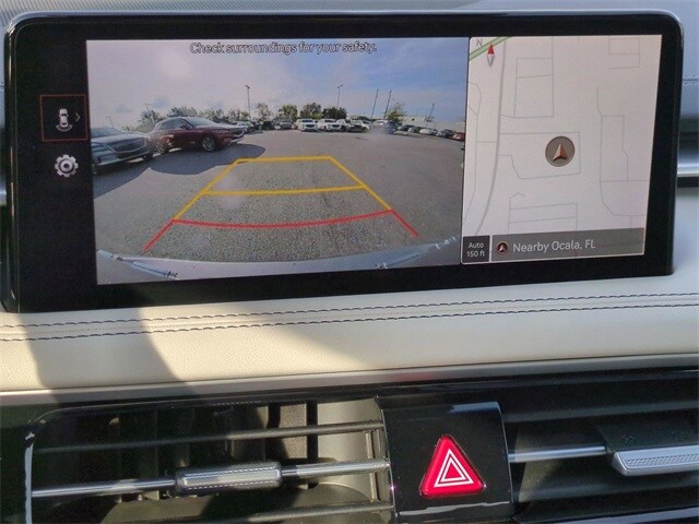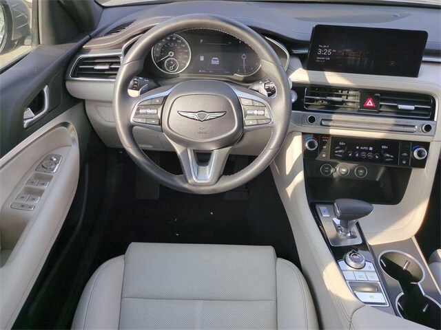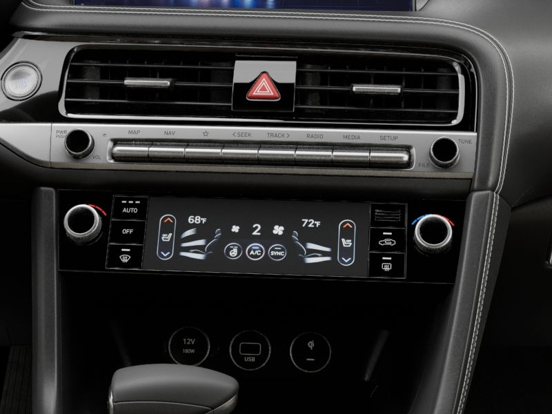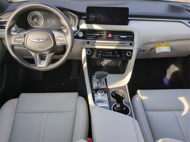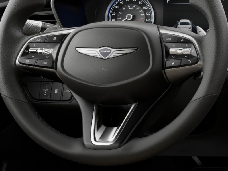 This vehicle comes equipped with Option Group 01, Genesis Certified, 4-Wheel Disc Brakes, 6 Speakers, ABS brakes, Air Conditioning, Alloy wheels, AM/FM radio: SiriusXM, Android Auto & Apple CarPlay, Anti-whiplash front head restraints, Auto High-beam Headlights, Auto-dimming Rear-View mirror, Automatic temperature control, Brake assist, Bumper Applique, Bumpers: body-color, Delay-off headlights, Driver door bin, Driver vanity mirror, Dual front impact airbags, Dual front side impact airbags, Electronic Stability Control, Emergency communication system: Genesis Connected Services, Exterior Parking Camera Rear, First Aid Kit, Four wheel independent suspension, Front anti-roll bar, Front Bucket Seats, Front Center Armrest, Front dual zone A/C, Front reading lights, Fully automatic headlights, Garage door transmitter: HomeLink, Heated door mirrors, Heated front seats, Heated Multi-Adjustable Front Bucket Seats, Heated steering wheel, Illuminated entry, Knee airbag, Leatherette Seating Surfaces, Low tire pressure warning, Navigation System, Occupant sensing airbag, Outside temperature display, Overhead airbag, Overhead console, Panic alarm, Passenger door bin, Passenger vanity mirror, Power door mirrors, Power driver seat, Power passenger seat, Power steering, Power windows, Radio: AM/FM/SiriusXM/HD Audio System, Rear anti-roll bar, Rear reading lights, Rear seat center armrest, Rear side impact airbag, Rear window defroster, Remote keyless entry, Reversible Cargo Tray, Security system, Speed control, Speed-Sensitive Wipers, Split folding rear seat, Steering wheel mounted audio controls, Tachometer, Telescoping steering wheel, Traction control, Trip computer, Turn signal indicator mirrors, Variably intermittent wipers, and Wheels: 19" x 8.0J Fr & 19" x 8.5J Rr Alloy .