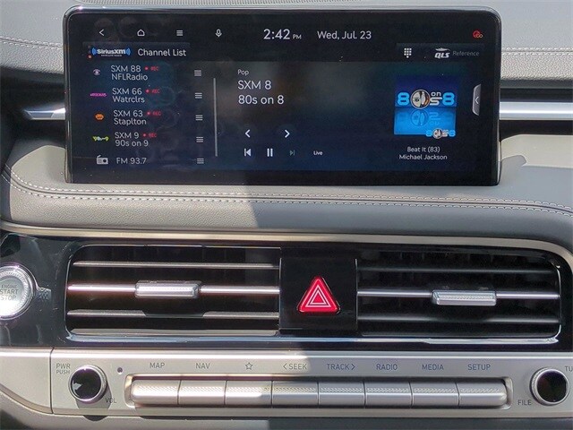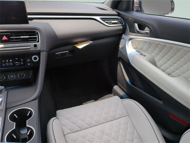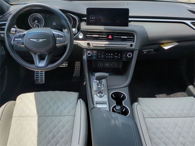 This vehicle comes equipped with Sport Prestige Package (Head-Up Display (HUD), Limited-Slip Differential, Nappa Leather Seating Surfaces, Option Group 04, and Power Trunk), Genesis Certified, 15 Speakers, 4-Wheel Disc Brakes, ABS brakes, Air Conditioning, All Season Fitted Liners, Alloy wheels, AM/FM radio: SiriusXM, Android Auto & Apple CarPlay, Anti-whiplash front head restraints, Auto High-beam Headlights, Auto-dimming door mirrors, Auto-dimming Rear-View mirror, Automatic temperature control, Brake assist, Bumpers: body-color, Delay-off headlights, Driver door bin, Driver vanity mirror, Dual front impact airbags, Dual front side impact airbags, Electronic Stability Control, Emergency communication system: Genesis Connected Services, Exterior Parking Camera Rear, First Aid Kit, Four wheel independent suspension, Front anti-roll bar, Front Bucket Seats, Front Center Armrest, Front dual zone A/C, Front reading lights, Fully automatic headlights, Garage door transmitter: HomeLink, Heated door mirrors, Heated front seats, Htd & Ventilated Multi-Adjustable Fr Bucket Seats, Illuminated entry, Knee airbag, Leather Seating Surfaces, Low tire pressure warning, Memory seat, Navigation System, Occupant sensing airbag, Outside temperature display, Overhead airbag, Overhead console, Panic alarm, Passenger door bin, Passenger vanity mirror, Power door mirrors, Power driver seat, Power moonroof, Power passenger seat, Power steering, Power windows, Radio: AM/FM/SiriusXM/HD Lexicon Prem Audio System, Rain sensing wipers, Rear anti-roll bar, Rear reading lights, Rear seat center armrest, Rear side impact airbag, Rear window defroster, Remote keyless entry, Reversible Cargo Tray, Security system, Speed control, Speed-sensing steering, Speed-Sensitive Wipers, Split folding rear seat, Steering wheel memory, Steering wheel mounted audio controls, Tachometer, Telescoping steering wheel, Traction control, Trip computer, Turn signal indicator mirrors, Variably intermittent wipers, Ventilated front seats, and Wheels: 19" x 8.0J Fr & 19" x 8.5J Rr Sport Alloy .