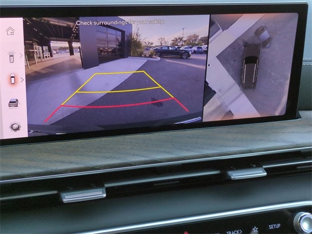 This vehicle comes equipped with Option Group 01, Genesis Certified, 18 Speakers, 4-Wheel Disc Brakes, ABS brakes, Adaptive suspension, Air Conditioning, Alloy wheels, AM/FM radio: SiriusXM, Anti-whiplash front head restraints, Auto High-beam Headlights, Auto tilt-away steering wheel, Auto-dimming door mirrors, Auto-dimming Rear-View mirror, Automatic temperature control, Brake assist, Bumpers: body-color, Cargo Net, Compass, Delay-off headlights, Driver door bin, Driver vanity mirror, Dual front impact airbags, Dual front side impact airbags, Electronic Stability Control, Emergency communication system: Genesis Connected Services, Exterior Parking Camera Rear, Four wheel independent suspension, Fragrance Cartridge, Front anti-roll bar, Front Bucket Seats, Front Center Armrest, Front dual zone A/C, Front reading lights, Fully automatic headlights, Garage door transmitter: HomeLink, Genuine wood console insert, Genuine wood dashboard insert, Genuine wood door panel insert, Heads-Up Display, Heated & Ventilated Front Bucket Seats, Heated door mirrors, Heated front seats, Heated rear seats, Heated steering wheel, Illuminated entry, Knee airbag, Leather Seating Surfaces, Leather steering wheel, Low tire pressure warning, Memory seat, Navigation System, Occupant sensing airbag, Outside temperature display, Overhead airbag, Overhead console, Panic alarm, Passenger door bin, Passenger vanity mirror, Power door mirrors, Power driver seat, Power Liftgate, Power moonroof, Power passenger seat, Power steering, Power windows, Radio data system, Radio: AM/FM/SiriusXM/HD Bang & Olufsen Sound Sys, Rain sensing wipers, Rear air conditioning, Rear anti-roll bar, Rear reading lights, Rear seat center armrest, Rear side impact airbag, Rear window defroster, Rear window wiper, Remote keyless entry, Security system, Speed control, Speed-sensing steering, Speed-Sensitive Wipers, Split folding rear seat, Spoiler, Steering wheel memory, Steering wheel mounted audio controls, Tachometer, Telescoping steering wheel, Tilt steering wheel, Traction control, Trip computer, Turn signal indicator mirrors, Variably intermittent wipers, Ventilated front seats, Wheel Locks, and Wheels: 22" x 9.5J Dark Gray Matte Alloy .