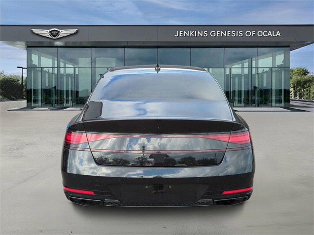 This vehicle comes equipped with Option Group 01, Genesis Certified, 4-Wheel Disc Brakes, ABS brakes, Adaptive suspension, Air Conditioning, Alloy wheels, AM/FM radio: SiriusXM, Anti-whiplash front head restraints, Auto High-beam Headlights, Auto tilt-away steering wheel, Auto-dimming door mirrors, Auto-dimming Rear-View mirror, Automatic temperature control, Brake assist, Cargo Mat, Compass, Delay-off headlights, Driver door bin, Driver vanity mirror, Dual front impact airbags, Dual front side impact airbags, Electronic Stability Control, Emergency communication system: Genesis Connected Services, Exterior Parking Camera Rear, Four wheel independent suspension, Front anti-roll bar, Front Bucket Seats, Front Center Armrest, Front dual zone A/C, Front reading lights, Fully automatic headlights, Garage door transmitter: HomeLink, Genuine wood console insert, Genuine wood dashboard insert, Genuine wood door panel insert, Heads-Up Display, Heated and Ventilated Front Bucket Seats, Heated front seats, Heated rear seats, Heated steering wheel, Illuminated entry, Knee airbag, Low tire pressure warning, Memory seat, Navigation System, Occupant sensing airbag, Outside temperature display, Overhead airbag, Overhead console, Panic alarm, Passenger door bin, Passenger vanity mirror, Power adjustable rear head restraints, Power door mirrors, Power driver seat, Power moonroof, Power passenger seat, Power steering, Power windows, Radio data system, Radio: AM/FM Bang & Olufsen 3D Prem Audio System, Rain sensing wipers, Rear air conditioning, Rear anti-roll bar, Rear reading lights, Rear seat center armrest, Rear side impact airbag, Rear Window Blind, Rear window defroster, Remote keyless entry, Security system, Semi-Aniline Leather Seating Surfaces, Speed control, Speed-sensing steering, Speed-Sensitive Wipers, Steering wheel memory, Steering wheel mounted audio controls, Tachometer, Telescoping steering wheel, Tilt steering wheel, Traction control, Trip computer, Variably intermittent wipers, Ventilated front seats, Ventilated rear seats, and Wheels: 21" x 8.5J Fr & 21" x 9.5J Rr Matte Black .