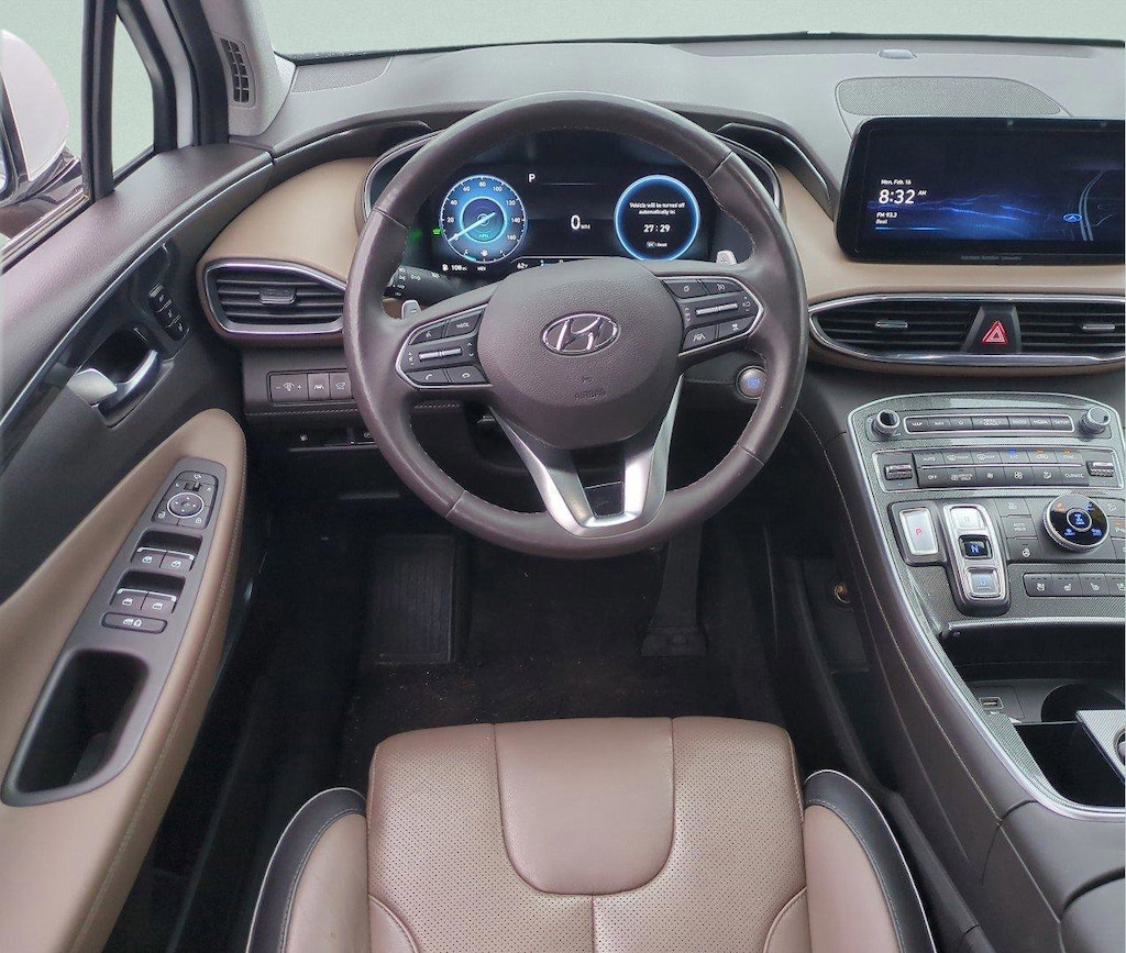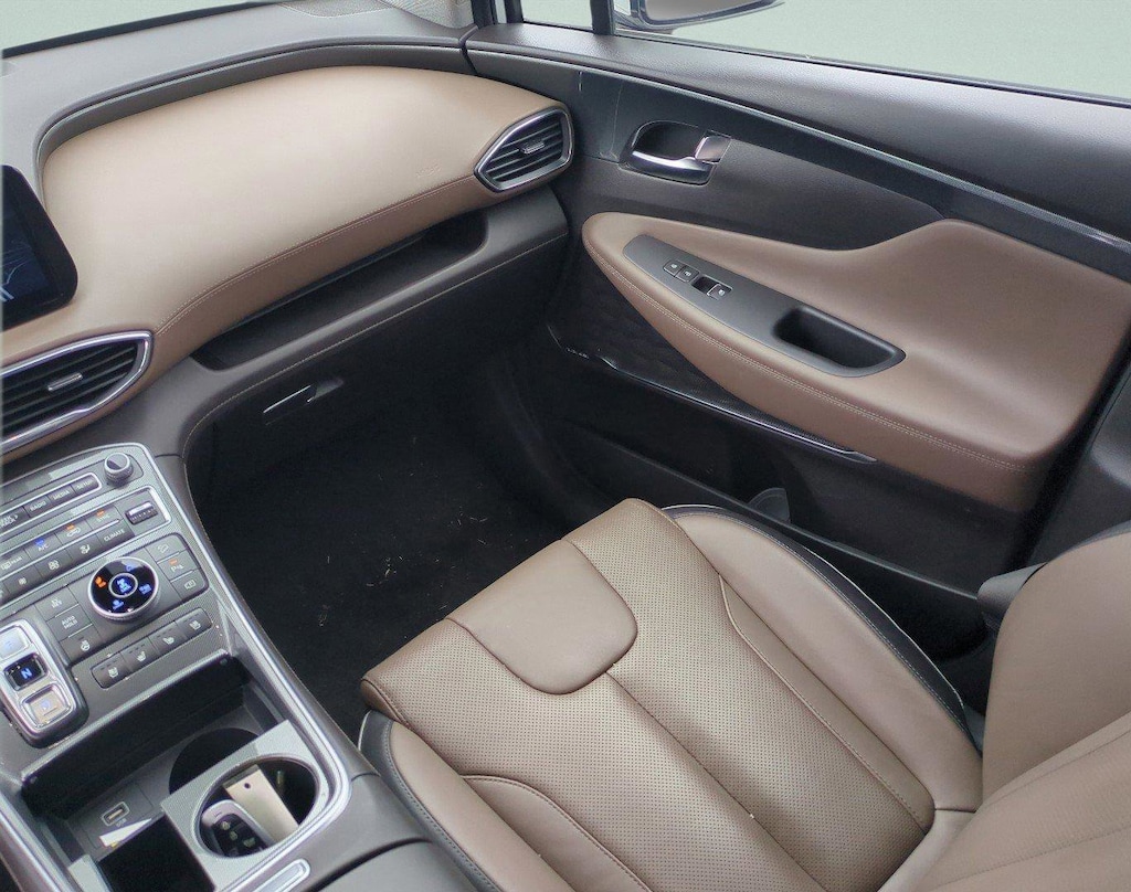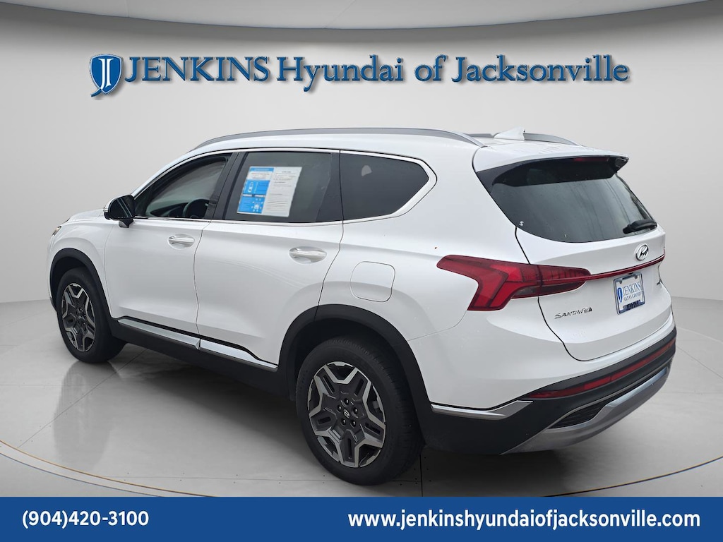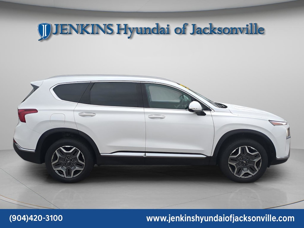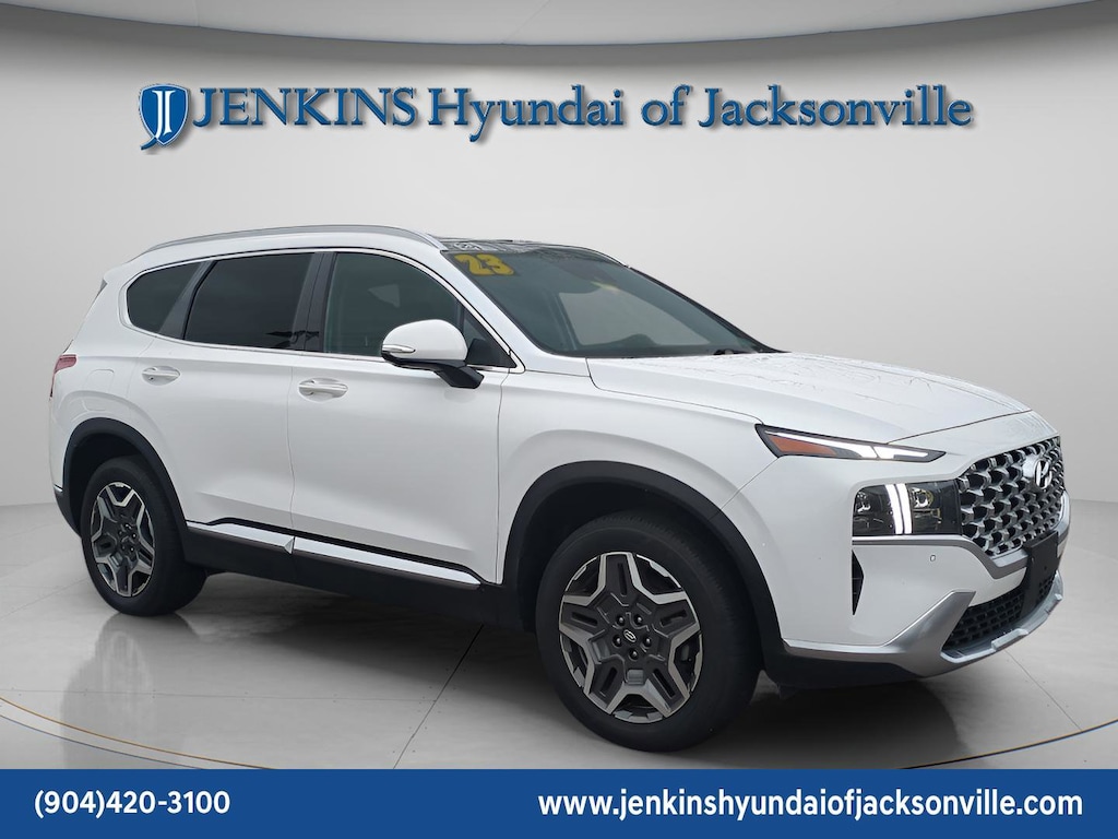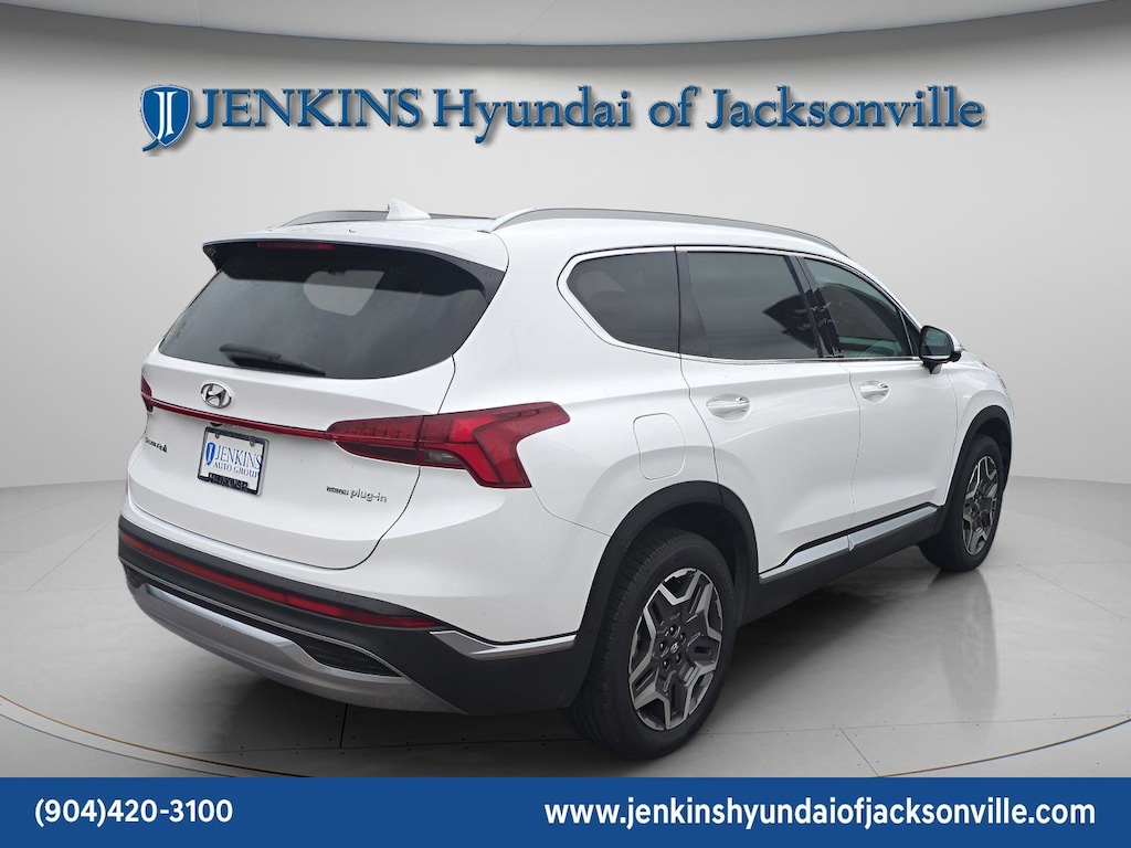 CARFAX One-Owner. Clean CARFAX. This 2023 Hyundai Santa Fe Plug-In Hybrid Limited in Serenity White Pearl features Option Group 01, 12 Speakers, 3.510 Axle Ratio, 4-Wheel Disc Brakes, ABS brakes, Air Conditioning, Alloy wheels, AM/FM radio: SiriusXM, Apple CarPlay & Android Auto, Auto High-beam Headlights, Auto-dimming Rear-View mirror, Automatic temperature control, Brake assist, Bumpers: body-color, Delay-off headlights, Driver door bin, Driver vanity mirror, Dual front impact airbags, Dual front side impact airbags, Electronic Stability Control, Emergency communication system, Exterior Parking Camera Rear, Four wheel independent suspension, Front anti-roll bar, Front Bucket Seats, Front Center Armrest, Front dual zone A/C, Front reading lights, Fully automatic headlights, Garage door transmitter: HomeLink, harman/kardon® Speakers, Heated & Ventilated Front Bucket Seats, Heated door mirrors, Heated front seats, Heated rear seats, Heated steering wheel, Illuminated entry, Leather Seat Trim, Leather steering wheel, Low tire pressure warning, Memory seat, Navigation System, Occupant sensing airbag, Outside temperature display, Overhead airbag, Overhead console, Panic alarm, Passenger door bin, Passenger vanity mirror, Power door mirrors, Power driver seat, Power Liftgate, Power moonroof, Power passenger seat, Power steering, Power windows, Radio: AM/FM Harman Kardon Audio, Rain sensing wipers, Rear anti-roll bar, Rear seat center armrest, Rear window defroster, Rear window wiper, Remote keyless entry, Security system, Speed control, Speed-sensing steering, Split folding rear seat, Spoiler, Steering wheel mounted audio controls, Tachometer, Telescoping steering wheel, Tilt steering wheel, Traction control, Trip computer, Turn signal indicator mirrors, Variably intermittent wipers, Ventilated front seats, and Wheels: 19" x 7.5J Alloy . Visit our showroom 24/7 at Jenkinshyundaiofjacksonville or call 904-420-3100. AWD