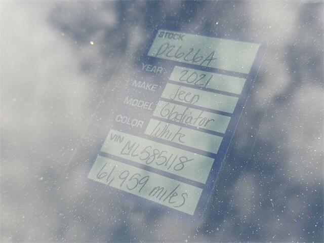 DECEMBER SAVINGS, END OF YEAR DEALS, GET THEM BEFORE THEY ARE GONE! The price does not include tax, tag, license, an electronic filing fee of $449.00**, a private tag agency fee of $199.00**, and a predelivery service charge of $1199.00** **This charge represents costs and profit to the dealer for items such as inspecting, cleaning, and adjusting vehicles, as well as preparing documents related to the sale. * EPA-estimate metric: these are contingent on ideal conditions within a lab. Real-world situations such as carrying passengers or cargo, using climate control, driving style, and ambient temperatures can affect actual metrics. 17/22 City/Highway MPG Clean CARFAX. Recent Arrival! Bright White Clearcoat 2021 Jeep Gladiator Mojave 4WD 8-Speed Automatic 3.6L V6 24V VVT