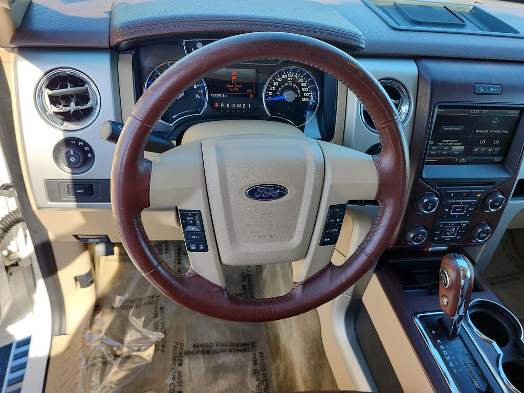 4WD, 10 Speakers, 20" Chrome-Clad Aluminum Wheels, 4x4 Off-Road Decal, 6" Chrome Angular Step Bars, Body-Color Door Handles w/Chrome Strap, Chrome Grille Surround, Electronic Locking w/3.55 Axle Ratio, Equipment Group 600A, Exterior Parking Camera Rear, Front & Rear Off-Road Tuned Shock Absorbers, Front dual zone A/C, Front fog lights, Fully automatic headlights, Garage door transmitter, GVWR: 7,350 lbs Payload Package, Heated front seats, Heated rear seats, High-Intensity Discharge Headlamps, Hill Descent Control, King Ranch Chaparral Leather Bucket Seats, King Ranch Chrome Package, King Ranch Luxury Package, Memory seat, Navigation, Off-Road Package, Overhead Console w/Single Storage Bin, Pedal memory, Power Moonroof, PowerFold Heated Side Mirrors w/Chrome Skull Caps, Premium audio system: Sony, Rear Parking Sensors, Rear window defroster, Security system, SiriusXM Satellite Radio, Speed-sensing steering, Steering wheel memory, Steering wheel mounted audio controls, SYNC Voice Activated Communication & Entertainment, SYNC w/MyFord Touch & SYNC Services, Tailgate Step, Traction control, Ventilated front seats. 15/21 City/Highway MPG