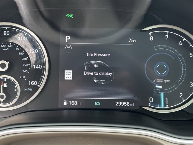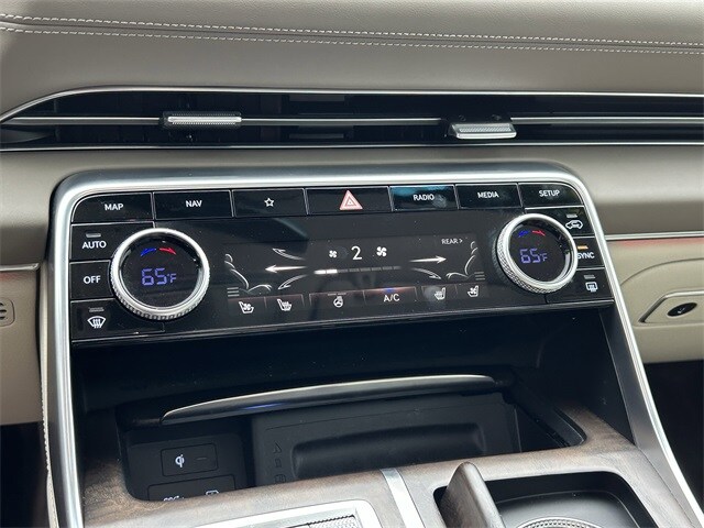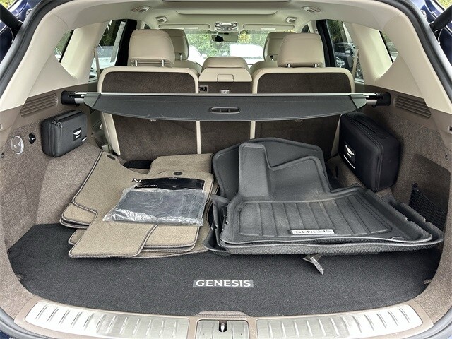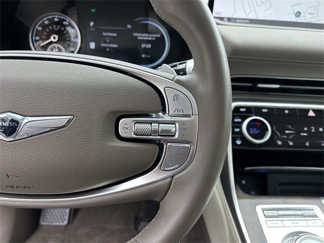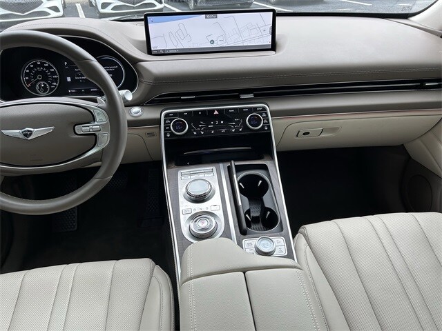 This vehicle comes equipped with Option Group 01, 12 Speakers, 3.909 Axle Ratio, 4-Wheel Disc Brakes, ABS brakes, Adaptive suspension, Air Conditioning, Alloy wheels, AM/FM radio: SiriusXM, Android Auto & Apple CarPlay, Anti-whiplash front head restraints, Auto High-beam Headlights, Auto tilt-away steering wheel, Auto-dimming door mirrors, Auto-dimming Rear-View mirror, Automatic temperature control, Brake assist, Bumpers: body-color, Compass, Delay-off headlights, Driver door bin, Driver vanity mirror, Dual front impact airbags, Dual front side impact airbags, Electronic Stability Control, Emergency communication system: Genesis Connected Services, Exterior Parking Camera Rear, Four wheel independent suspension, Front anti-roll bar, Front Bucket Seats, Front Center Armrest, Front dual zone A/C, Front reading lights, Fully automatic headlights, Garage door transmitter: HomeLink, Genuine wood console insert, Genuine wood dashboard insert, Genuine wood door panel insert, Heated & Ventilated Front Bucket Seats, Heated door mirrors, Heated front seats, Heated steering wheel, Illuminated entry, Knee airbag, Leather steering wheel, Leatherette Seating Surfaces, Low tire pressure warning, Memory seat, Nappa Leather Seating Surfaces, Navigation System, Occupant sensing airbag, Outside temperature display, Overhead airbag, Overhead console, Panic alarm, Passenger door bin, Passenger vanity mirror, Power door mirrors, Power driver seat, Power Liftgate, Power moonroof, Power passenger seat, Power steering, Power windows, Radio data system, Radio:14.5" Navigation System w/AM/FM/HD Radio, Rain sensing wipers, Rear air conditioning, Rear anti-roll bar, Rear Bumper Applique, Rear reading lights, Rear seat center armrest, Rear side impact airbag, Rear window defroster, Rear window wiper, Remote keyless entry, Reversible Cargo Tray, Roof Rack Cross Bars, Security system, Speed control, Speed-sensing steering, Speed-Sensitive Wipers, Split folding rear seat, Spoiler, Steering wheel memory, Steering wheel mounted audio controls, Tachometer, Telescoping steering wheel, Tilt steering wheel, Traction control, Trip computer, Turn signal indicator mirrors, Variably intermittent wipers, Ventilated front seats, and Wheels: 20" x 8.5J Medium Metallic Gray Alloy .