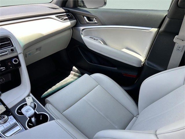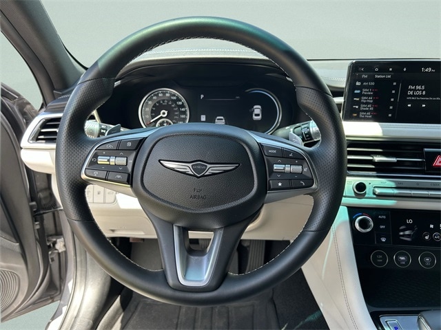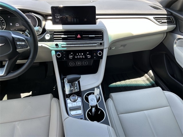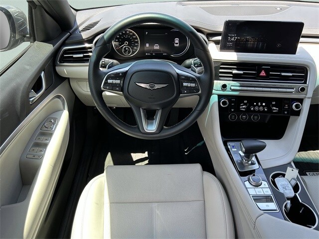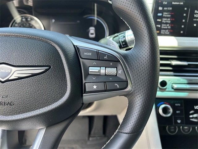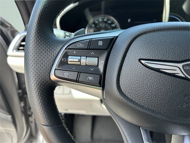 This vehicle comes equipped with Option Group 01, 4-Wheel Disc Brakes, 6 Speakers, ABS brakes, Air Conditioning, Alloy wheels, AM/FM radio: SiriusXM, Android Auto & Apple CarPlay, Anti-whiplash front head restraints, Auto High-beam Headlights, Auto-dimming Rear-View mirror, Automatic temperature control, Brake assist, Bumper Applique, Bumpers: body-color, Delay-off headlights, Driver door bin, Driver vanity mirror, Dual front impact airbags, Dual front side impact airbags, Electronic Stability Control, Emergency communication system: Genesis Connected Services, Exterior Parking Camera Rear, First Aid Kit, Four wheel independent suspension, Front anti-roll bar, Front Bucket Seats, Front Center Armrest, Front dual zone A/C, Front reading lights, Fully automatic headlights, Garage door transmitter: HomeLink, Heated door mirrors, Heated front seats, Heated Multi-Adjustable Front Bucket Seats, Illuminated entry, Knee airbag, Leather steering wheel, Leatherette Seating Surfaces, Low tire pressure warning, Navigation System, Occupant sensing airbag, Outside temperature display, Overhead airbag, Overhead console, Panic alarm, Passenger door bin, Passenger vanity mirror, Power door mirrors, Power driver seat, Power passenger seat, Power steering, Power windows, Radio: AM/FM/SiriusXM/HD Audio System, Rear anti-roll bar, Rear reading lights, Rear seat center armrest, Rear side impact airbag, Rear window defroster, Remote keyless entry, Reversible Cargo Tray, Roadside Assistance, Security system, Speed control, Speed-Sensitive Wipers, Split folding rear seat, Steering wheel mounted audio controls, Tachometer, Telescoping steering wheel, Traction control, Trip computer, Turn signal indicator mirrors, Variably intermittent wipers, Wheel Locks, and Wheels: 19" x 8.0J Fr & 19" x 8.5J Rr Alloy . 21/29 City/Highway MPG