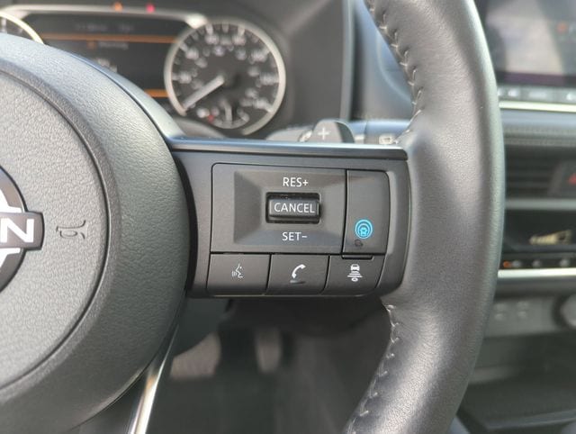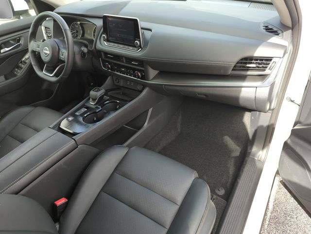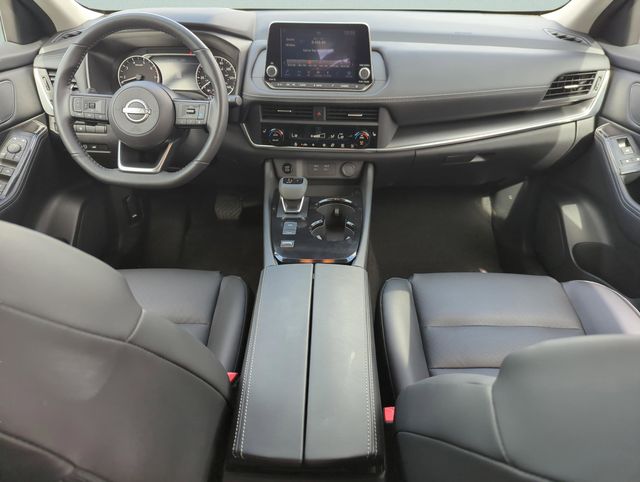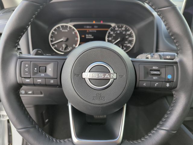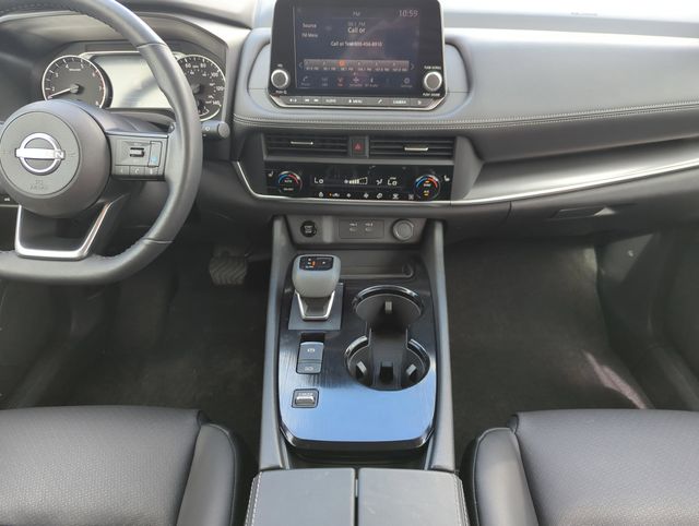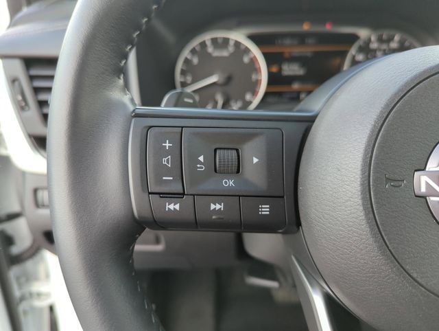 The interior of the Rogue SV Premium Package is a testament to Nissan's commitment to quality and attention to detail. The spacious cabin is adorned with premium materials, including the heated leather-wrapped steering wheel and leatherette door trim inserts with stitching. The panoramic moonroof floods the cabin with natural light, creating a truly inviting atmosphere.